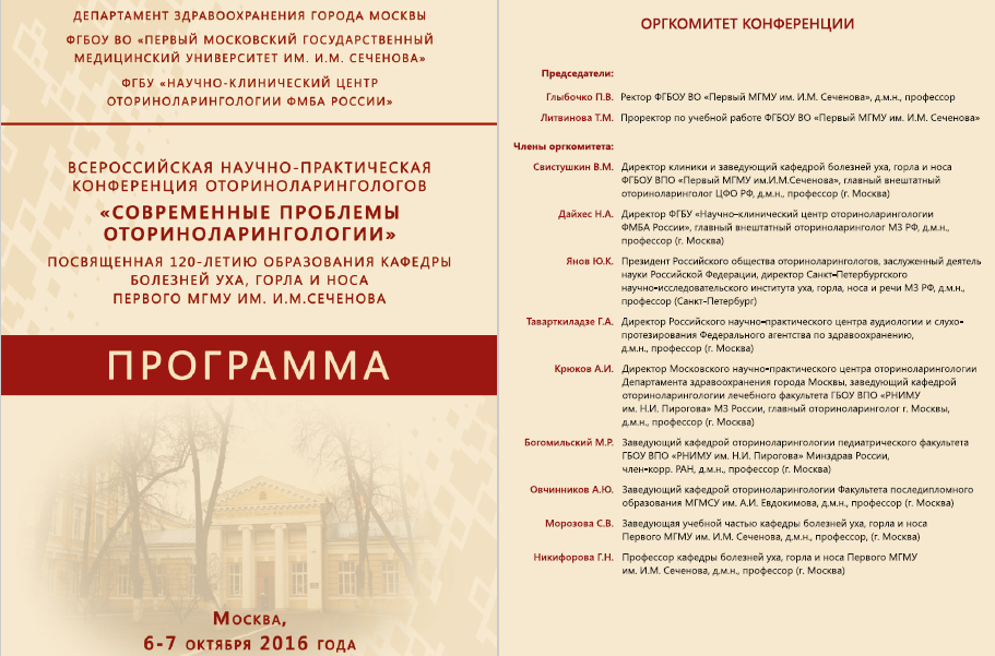 Всероссийская научно-практическая конференция «Современные проблемы оториноларингологии», посвященная 120-летию кафедры болезней уха, горла и носа Первого МГМУ им. И.М. Сеченова