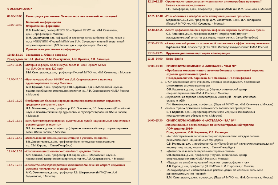 Приглашаем вас принять участие во Всероссийской научно-практической конференции «Современные проблемы оториноларингологии», посвященной 120-летию образования кафедры болезней уха, горла и носа Первого МГМУ им. И.М. Сеченова, которая состоится 6-7 октября 2016 г. по адресу: г. Москва, ул. Новый Арбат, д. 36, здание Правительства Москвы. Начало работы конференции 6 октября в 09:00.