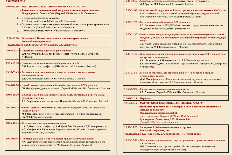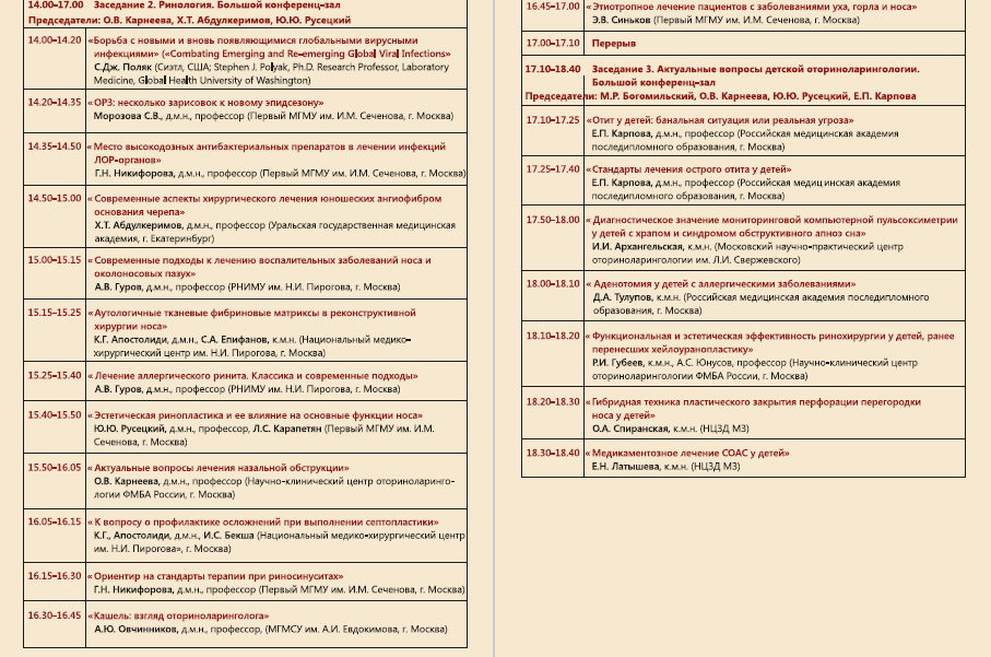 В рамках мероприятия пройдут секционные заседания по ринологии, отиатрии, аудиологии, фониатрии, детской оториноларингологии и другим разделам специальности, а так же симпозиумы, мастер-классы, круглые столы.